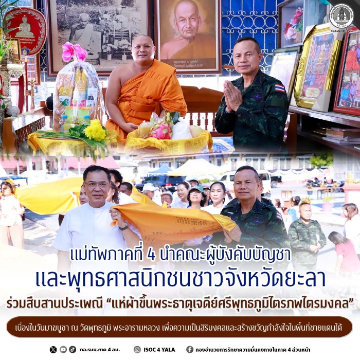 วันนี้ (3 มีนาคม 2569) เวลา 15.30 น. ที่วัดพุทธภูมิ พระอารามหลวง อำเภอเมือง จังหวัดยะลา พลโท นรธิป โพยนอก แม่ทัพภาคที่ 4 ในฐานะผู้อำนวยการรักษาความมั่นคงภายในภาค 4 เป็นประธานในพิธีจัดกิจกรรมสืบสานประเพณี “แห่ผ้าขึ้นพระธาตุเจดีย์ศรีพุทธภูมิไตรภพไตรมงคล” เนื่องในวันมาฆบูชา โดยมี พระสิริปัญญาคุณ ดอกเตอร์ เจ้าอาวาสวัดเมืองยะลา เป็นประธานฝ่ายสงฆ์ พร้อมด้วยคณะผู้บังคับบัญชา หัวหน้าส่วนราชการ และพุทธศาสนิกชนในพื้นที่จังหวัดยะลา เดินทางมาร่วมอัญเชิญผ้าห่มองค์พระธาตุเจดีย์ฯ อย่างพร้อมเพรียงกัน ท่ามกลางการดูแลรักษาความปลอดภัยอย่างเข้มงวดจากเจ้าหน้าที่ ทั้งภายในและภายนอกบริเวณวัด