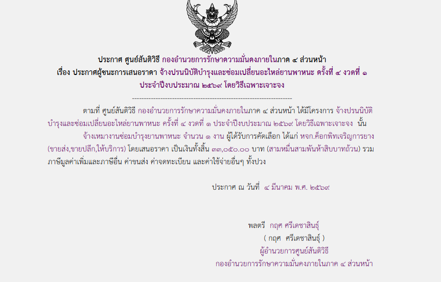 จัดซื้อ จัดจ้างประกาศผู้ชนะการเสนอราคา ประกาศผู้ชนะการเสนอราคา จ้างปรนนิบัติบำรุงและซ่อมเปลี่ยนอะไหล่ยานพาหนะ ครั้งที่ ๔ งวดที่ ๑ ประจำปีงบประมาณ ๒๕๖๙ โดยวิธีเฉพาะเจาะจง March 4, 2026 11 Share Facebook Twitter Google+ Telegram LINE