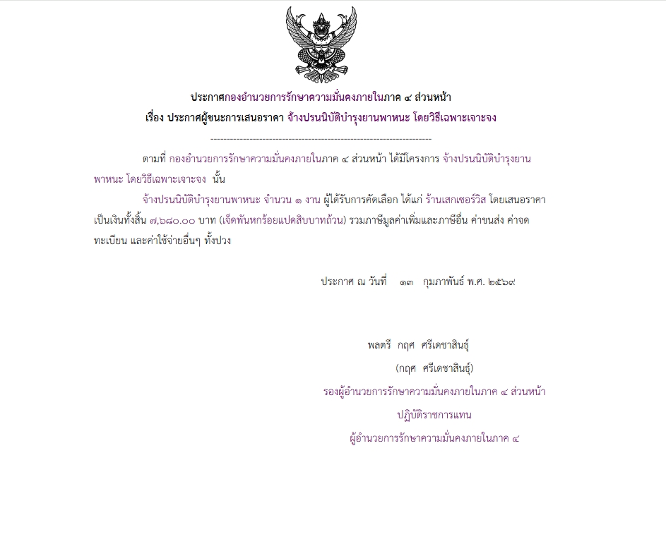 จัดซื้อ จัดจ้างประกาศผู้ชนะการเสนอราคา ประกาศผู้ชนะการเสนอราคาจ้างปรนนิบัติบำรุงยานพาหนะ โดยวิธีเฉพาะเจาะจง March 4, 2026 12 Share Facebook Twitter Google+ Telegram LINE ประกาศผู้ชนะการเสนอราคาจ้างปรนนิบัติบำรุงยานพาหนะ โดยวิธีเฉพาะเจาะจง