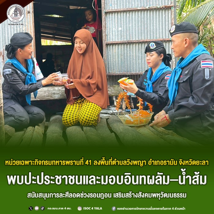 เมื่อวันที่ 3 มีนาคม 2569 เวลา 14.00 น. หน่วยเฉพาะกิจกรมทหารพรานที่ 41 จัดกำลังพลชุดปฏิบัติการกิจการพลเรือน กองร้อยทหารพรานที่ 4113 และหมวดทหารพรานหญิง ลงพื้นที่ตำบลวังพญา อำเภอรามัน จังหวัดยะลา พบปะเยี่ยมเยียนประชาชน พูดคุยสอบถามความเป็นอยู่ พร้อมมอบอินทผลัมและน้ำส้ม สำหรับใช้ในการละศีลอดช่วงเดือนรอมฎอน ฮิจเราะห์ศักราช 1447