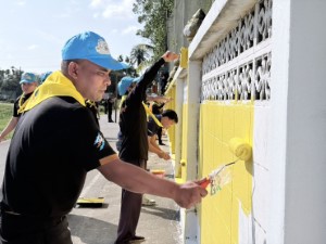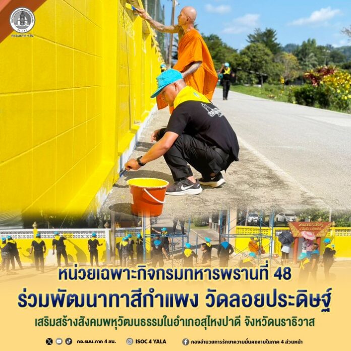 วันที่ 3 มีนาคม 2569 เวลา 08.00 น. พันเอก รังสรรค์ นนธีระสวัสดิ์ รองผู้บังคับหน่วยเฉพาะกิจกรมทหารพรานที่ 48 พร้อมด้วยฝ่ายกิจการพลเรือน บูรณาการความร่วมมือกับผู้นำท้องถิ่น ผู้นำท้องที่ ส่วนราชการ และประชาชนจิตอาสา จัดกิจกรรมจิตอาสา “เราทำความดี ด้วยหัวใจ” เพื่อพัฒนาปรับปรุงและทาสีกำแพงวัด สร้างความเป็นระเบียบเรียบร้อย สวยงาม และร่วมทำนุบำรุงพระพุทธศาสนา ณ วัดลอยประดิษฐ์ ตำบลโต๊ะเด็ง อำเภอสุไหงปาดี จังหวัดนราธิวาส โดยกิจกรรมในครั้งนี้ได้รับการสนับสนุนวัสดุอุปกรณ์จาก กองภาคประชาสังคม ศูนย์สันติวิธี สะท้อนถึงความร่วมมือของทุกภาคส่วนในการส่งเสริมการมีส่วนร่วมของประชาชน และการพัฒนาพื้นที่อย่างสร้างสรรค์ โดยเฉพาะการดูแลและเสริมสร้างความเข้มแข็งให้กับชุมชนไทยพุทธในพื้นที่ ควบคู่กับการส่งเสริมความเข้าใจอันดีระหว่างประชาชนทุกกลุ่ม