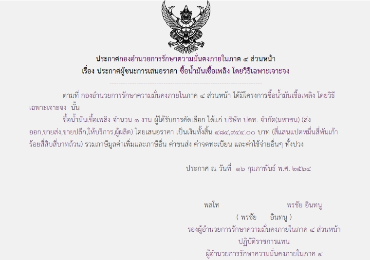 ประกาศผู้ชนะการเสนอราคา ซื้อน้ำมันเชื้อเพลิง โดยวิธีเฉพาะเจาะจง (484,944.00)