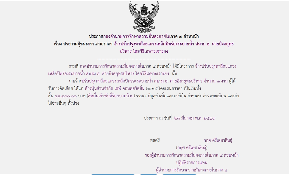 จัดซื้อ จัดจ้างประกาศผู้ชนะการเสนอราคา ประกาศผู้ชนะการเสนอราคา จ้างปรับปรุงทาสีตะแกรงเหล็กปิดร่องระบายน้ำ สนาม ฮ. ค่ายอิงคยุทธบริหาร โดยวิธีเฉพราะเจาะจง March 5, 2026 6 Share Facebook Twitter Google+ Telegram LINE