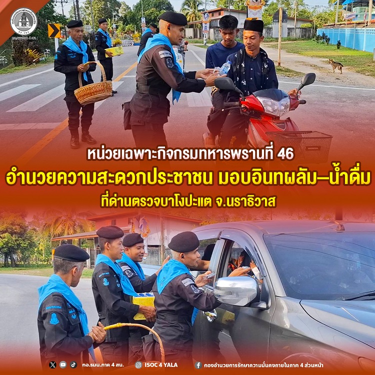 เมื่อวันที่ 4 มี.ค. 69 เวลา 17.00 น. หน่วยเฉพาะกิจกรมทหารพรานที่ 46 จัดกำลังพลชุดปฏิบัติการกิจการพลเรือน กองร้อยทหารพราน 4609 ลงพื้นที่ปฏิบัติภารกิจอำนวยความสะดวกและดูแลความปลอดภัยให้กับประชาชนที่ใช้เส้นทาง ทางหลวงชนบทหมายเลข 4018 บริเวณหน้าฐานปฏิบัติการกองร้อยทหารพรานที่ 4609 บ้านบาโงปะแต หมู่ที่ 1 ตำบลโคกสะตอ อำเภอรือเสาะ จังหวัดนราธิวาส โดยเจ้าหน้าที่ทหารพรานได้ร่วมมอบ อินทผลัมและน้ำดื่ม ให้กับประชาชนที่สัญจรผ่านไป–มา จำนวน 25 ชุด เพื่อร่วมแสดงความยินดีและสร้างบรรยากาศแห่งการแบ่งปัน เนื่องในโอกาสช่วงเดือนรอมฎอน ฮิจเราะห์ศักราช 1447 สร้างรอยยิ้มและความประทับใจให้กับผู้ใช้เส้นทางเป็นอย่างดี