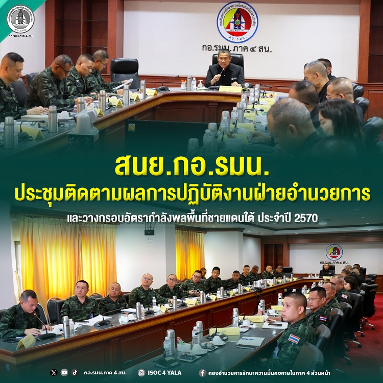 ️ วันที่ 5 มีนาคม 2569 เวลา 10.30 น. ณ ห้องประชุม 2 กองอำนวยการรักษาความมั่นคงภายในภาค 4 ส่วนหน้า พลตรี สัมพันธ์ อิสริยเตชะ รองผู้อำนวยการสำนักนโยบายและยุทธศาสตร์ความมั่นคง กองอำนวยการรักษาความมั่นคงภายในราชอาณาจักร เป็นประธานในการประชุมขับเคลื่อนการปฏิบัติงานทางฝ่ายอำนวยการ เพื่อติดตามความคืบหน้าการดำเนินงานของหน่วยงานในพื้นที่จังหวัดชายแดนภาคใต้ โดยมีผู้แทนสำนักอำนวยการ กอ.รมน.ภาค 4 สน. และส่วนราชการที่เกี่ยวข้องเข้าร่วมประชุม