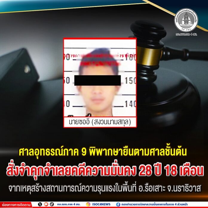 โดยคดีนี้ ศาลอุทธรณ์ภาค 9 มีคำพิพากษายืนตามคำพิพากษาศาลจังหวัดนราธิวาส ให้ลงโทษ จำคุกจำเลยเป็นเวลา 28 ปี 18 เดือน เนื่องจากพยานหลักฐานของโจทก์มีความชัดเจน โดยเฉพาะผลการตรวจสอบทางนิติวิทยาศาสตร์ ที่ตรวจพบสารพันธุกรรม หรือ DNA ของจำเลย บนวัตถุพยานภายในฐานปฏิบัติการในที่เกิดเหตุ