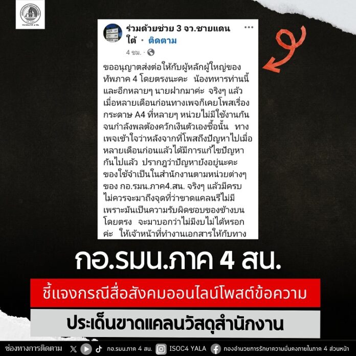 กองอำนวยการรักษาความมั่นคงภายในภาค 4 ส่วนหน้า (กอ.รมน.ภาค 4 สน.) ชี้แจงกรณีมีการเผยแพร่ข้อความในสื่อสังคมออนไลน์เกี่ยวกับประเด็นการขาดแคลนวัสดุสำนักงาน โดยขอขอบคุณเพจและประชาชนที่ได้สะท้อนความคิดเห็นและแสดงความห่วงใยต่อการปฏิบัติงานของหน่วยงาน