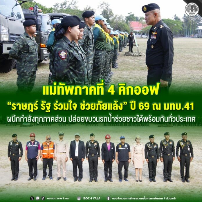 วันที่ 5 มีนาคม 2569 เวลา 1400 พลโท นรธิป โพยนอก แม่ทัพภาคที่ 4 / ผู้บัญชาการศูนย์บรรเทาสาธารณภัย กองทัพภาคที่ 4 / ผู้อำนวยการรักษาความมั่นคงภายในภาค 4 เป็นประธานในพิธีเปิดโครงการ “ราษฎร์ รัฐ ร่วมใจ ช่วยภัยแล้ง” ประจำปี 2569 ของกองทัพภาคที่ 4 ณ มณฑลทหารบกที่ 41 (มทบ.41) ค่ายวชิราวุธ จังหวัดนครศรีธรรมราช โดยบูรณาการกับภาคส่วนต่าง ๆ ในพื้นที่ เป็นการปล่อยขบวนและกำลังพลเพื่อเข้าช่วยเหลือประชาชนที่ประสบภัยแล้ง พร้อมกับการ Kick-off ของกองทัพบกในระดับประเทศทั้ง 4 กองทัพภาค