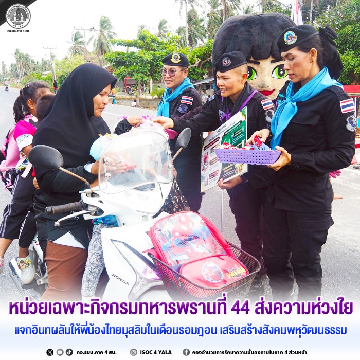 วันที่ 6 มีนาคม 2569 เวลา 17.00 น. หน่วยเฉพาะกิจกรมทหารพรานที่ 44 จัดกำลังพลชุดปฏิบัติการกิจการพลเรือนหญิง (ชป.กร.หญิง) ลงพื้นที่แจกอินทผลัมให้กับพี่น้องประชาชนที่สัญจรผ่านจุดตรวจในพื้นที่ พร้อมมอบขนมให้กับเด็ก ๆ เพื่อร่วมแบ่งปันความปรารถนาดีและอำนวยความสะดวกให้กับพี่น้องชาวไทยมุสลิมที่กำลังถือศีลอดในช่วงเดือนรอมฎอน ฮิจเราะห์ศักราช 1447 ทั้งนี้ เพื่อเป็นการสนับสนุนให้ประชาชนได้ใช้สำหรับการละศีลอดตามหลักศาสนาอิสลาม อีกทั้งยังสะท้อนถึงความห่วงใยและความเคารพต่อวิถีชีวิต วัฒนธรรม และความเชื่อของพี่น้องมุสลิมในพื้นที่
