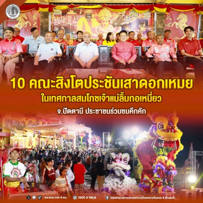 วันที่ 6 มีนาคม 2569 นายปิยะศิริ วัฒนวรางกูร เลขาธิการศูนย์อำนวยการบริหารจังหวัดชายแดนภาคใต้ (ศอ.บต.) เป็นประธานในพิธีเปิดการแข่งขันการเชิดสิงโตบนเสาดอกเหมย ประเทศไทย ประจำปี 2569 ในเทศกาลท่องเที่ยวปัตตานีอาเซียน “กตัญญูคู่ฟ้า มหาสมโภชเจ้าแม่ลิ้มกอเหนี่ยว” ณ บริเวณหน้าศาลเจ้าเล่งจูเกียงปัตตานี โดยมี นายสนั่น สนธิเมือง รองผู้ว่าราชการจังหวัดปัตตานี ตลอดจนผู้แทนหน่วยงานต่างๆ เข้าร่วม อาทิ ท่องเที่ยวและกีฬาจังหวัดปัตตานี, ผู้อำนวยการการท่องเที่ยวแห่งประเทศไทย สำนักงานปัตตานี, รองนายกเทศมนตรีเมืองปัตตานี, ประธานสภาวัฒนธรรมจังหวัดปัตตานี, ประธานกรรมการมูลนิธิเทพปูชนียสถาน (เจ้าแม่ลิ้มกอเหนี่ยว) และประชาชนทั้งในและนอกพื้นที่ร่วมงานอย่างคึกคัก