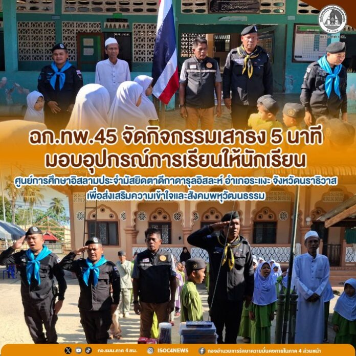 เมื่อวันที่ 8 มีนาคม 2569 เวลา 08.30 น. หน่วยเฉพาะกิจกรมทหารพรานที่ 45 จัดกำลังพลชุดปฏิบัติการกิจการพลเรือน กองร้อยทหารพรานที่ 4516 ลงพื้นที่ ร่วมกับผู้ใหญ่บ้านบ้านบาตูบือซา หมู่ที่ 6 เพื่อพบปะเยี่ยมเยือนและสร้างความเข้าใจกับครูและนักเรียนโรงเรียนตาดีกา ณ ศูนย์การศึกษาอิสลามประจำมัสยิดตาดีกาดารุลอิสละห์ บ้านบาตูบือซา หมู่ที่ 6 ตำบลบาโงสะโต อำเภอระแงะ จังหวัดนราธิวาส พร้อมทั้งได้จัดกิจกรรม “เสาธง 5 นาที” เพื่อเปิดโอกาสให้นักเรียนได้แสดงออกถึงความรักและความภาคภูมิใจในชาติ ศาสนา และพระมหากษัตริย์ พร้อมทั้งส่งเสริมการเรียนรู้และปลูกฝังค่านิยมที่ดีให้กับเยาวชน