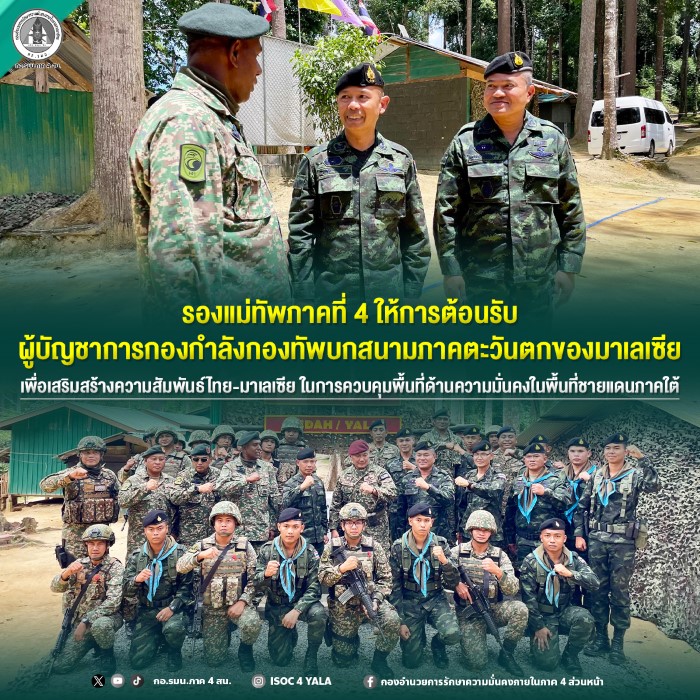 วันที่ 8 มีนาคม 2569 พลตรี ชาคริต อุจะรัตน รองแม่ทัพภาคที่ 4 / รองผู้อำนวยการรักษาความมั่นคงภายในภาค 4 ส่วนหน้า ในฐานะผู้แทนแม่ทัพภาคที่ 4 /ประธานคณะกรรมการชายแดนส่วนภูมิภาค (กชภ.) ลงพื้นที่ ณ ฐานปฏิบัติการบ้านดีดะ หมวดป้องกันชายแดนที่ 3 กองร้อยป้องกันชายแดนที่ 1 ตำบลถ้ำทะลุ อำเภอบันนังสตา จังหวัดยะลา เพื่อให้การต้อนรับ พลโท ดาโต๊ะ ไครุล อัซมิซาล บิน อาหมัด นาตาล ผู้บัญชาการกองกำลังกองทัพบกสนามภาคตะวันตกของมาเลเซีย พร้อมคณะ ในการตรวจเยี่ยมและให้กำลังใจกำลังพล ในส่วนของ “ฐานปฏิบัติการร่วมไทย – มาเลเซีย บ้านดีดะ” ซึ่งเป็นการปฏิบัติภารกิจ ร่วมกันทั้ง 2 ประเทศ ระหว่างประเทศไทย กับ ประเทศมาเลเซีย โดยมี พันเอก ชัยพิพัฒน์ อินทรเทพ ผู้บังคับหน่วยเฉพาะกิจกองพันทหารราบที่ 1 และ พันเอก ภูมิพัฒน์ บุญเรืองขาว รองผู้บังคับหน่วยเฉพาะกิจยะลา และกำลังพลเข้าร่วม