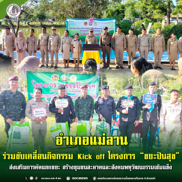 เมื่อวันที่ 9 มีนาคม 2569 เวลา 08.30 น. นายรัฎฐา เนตรสว่าง นายอำเภอแม่ลาน / ผู้อำนวยการศูนย์ปฏิบัติการป้องกันและปราบปรามยาเสพติด อำเภอแม่ลาน เป็นประธานในพิธีเปิดกิจกรรม Kick off โครงการ “ขยะปันสุข” ภายใต้แผนปฏิบัติการจัดการขยะมูลฝอยชุมชน “จังหวัดสะอาด” ประจำปี 2569 ณ ว่าที่ทำการอำเภอ หมู่ที่ 4 ตำบลแม่ลาน อำเภอแม่ลาน จังหวัดปัตตานี กิจกรรมดังกล่าวจัดขึ้นจากความร่วมมือของหน่วยงานในพื้นที่ โดย หน่วยเฉพาะกิจทหารพรานที่ 43 นำกำลังพลจากกองร้อยทหารพรานที่ 4304 และกองร้อยทหารพรานที่ 4312 ร่วมกับส่วนราชการอำเภอแม่ลาน องค์การบริหารส่วนตำบลแม่ลาน ชุดสันติสุข 506 ชุดทักษิณสัมพันธ์ 955 ตลอดจนกำนัน ผู้ใหญ่บ้าน และผู้ช่วยผู้ใหญ่บ้านในพื้นที่