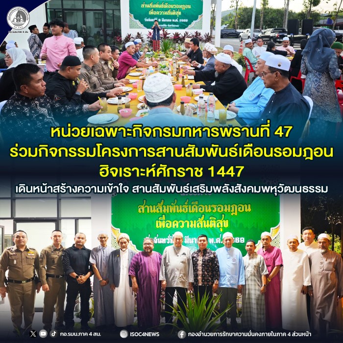 เมื่อวันที่ 9 มีนาคม 2569 เวลา 17.30 น. พันเอก เรวัตร เซ่งเข็ม ผู้บังคับหน่วยเฉพาะกิจกรมทหารพรานที่ 47 พร้อมด้วย นายอภิชาติ ศรีสุวรรณ์ นายอำเภอกรงปินัง, พันตำรวจเอก สิทธิศักดิ์ จันทร์สว่าง รองผู้บังคับการตำรวจภูธรจังหวัดยะลา, พันตำรวจเอก ต่อพันธ์ ปุสันเทียะ ผู้กำกับการสถานีตำรวจภูธรกรงปินัง, นายอับดุลอายี สาแม็ง สมาชิกสภาผู้แทนราษฎรจังหวัดยะลา เขต 3 รวมทั้งกำลังพล ผู้นำท้องที่ ผู้นำท้องถิ่น และผู้นำศาสนาในพื้นที่ ร่วมกิจกรรมโครงการสานสัมพันธ์เดือนรอมฎอน ฮิจเราะห์ศักราช 1447 ณ ที่ทำการอำเภอกรงปินัง หมู่ที่ 3 ตำบลสะเอะ อำเภอกรงปินัง จังหวัดยะลา โดยมี นายมูฮัมหมัด ศานติภิมุข รองผู้ว่าราชการจังหวัดยะลา เป็นประธานในพิธี