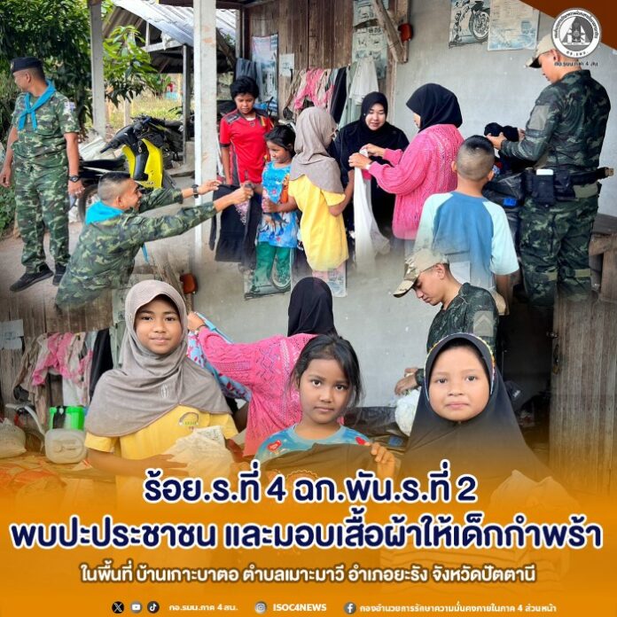 เมื่อวันที่ 9 มีนาคม 2569 เวลา 17.00 น. ร้อยเอก กิตติพัฒน์ เธียรธัญกุล ผู้บังคับกองร้อยทหารราบที่ 4 หน่วยเฉพาะกิจ กองพันทหารราบที่ 2 พร้อมด้วยชุดปฏิบัติการกิจการพลเรือน กองร้อยทหารราบที่ 4 หน่วยเฉพาะกิจ กองพันทหารราบที่ 2 ร่วมกับผู้นำชุมชน ลงพื้นที่พบปะพี่น้องประชาชน ณ หมู่ที่ 5 บ้านเกาะบาตอ ตำบลเมาะมาวี อำเภอยะรัง จังหวัดปัตตานี เพื่อสอบถามสารทุกข์สุกดิบ รับฟังปัญหาความเป็นอยู่ และเสริมสร้างความสัมพันธ์อันดีระหว่างเจ้าหน้าที่รัฐกับประชาชนในพื้นที่