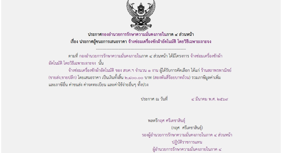 ประกาศผู้ชนะการเสนอราคา จ้างซ่อมเครื่องซักผ้าอัตโนมัติ โดยวิธีเฉพาะเจาะจง