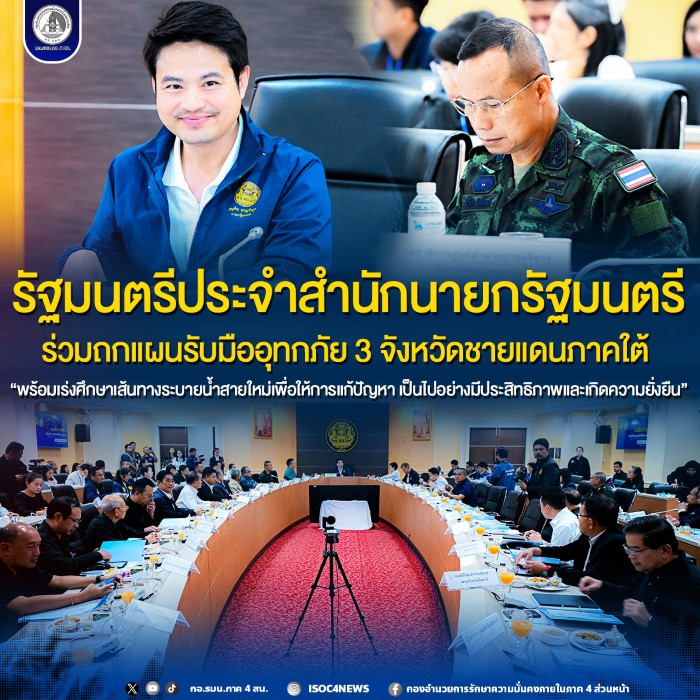 วันนี้ (11 มีนาคม 2569) รัฐบาล โดยนายภราดร ปริศนานันทกุล รัฐมนตรีประจำสำนักนายกรัฐมนตรีและที่ปรึกษาคณะทำงาน ลงพื้นที่ศูนย์อำนวยการบริหารจังหวัดชายแดนภาคใต้ (ศอ.บต.) อ.เมือง จ.ยะลา เพื่อประชุมคณะทำงานจัดทำแผนงานการเตรียมความพร้อมรับมืออุทกภัยให้เกิดความยั่งยืนในพื้นที่ 3 จชต. ครั้งที่ 1/2569 โดยมี นางสาวรัชดา ธนาดิเรก ผู้ช่วยรัฐมนตรีประจำสำนักนายกรัฐมนตรี นายปิยะศิริ วัฒนวรางกูร เลขาธิการ ศอ.บต. พลโท นรธิป โพยนอก แม่ทัพภาคที่ 4 / ผู้อำนวยการรักษาความมั่นคงภายในภาค 4 พร้อมด้วยผู้ว่าราชการจังหวัด เลขาธิการสำนักงานทรัพยากรน้ำแห่งชาติ และผู้แทนส่วนราชการที่เกี่ยวข้อง เข้าร่วมประชุม ณ ห้องประชุมปัญจเพชร ศอ.บต.