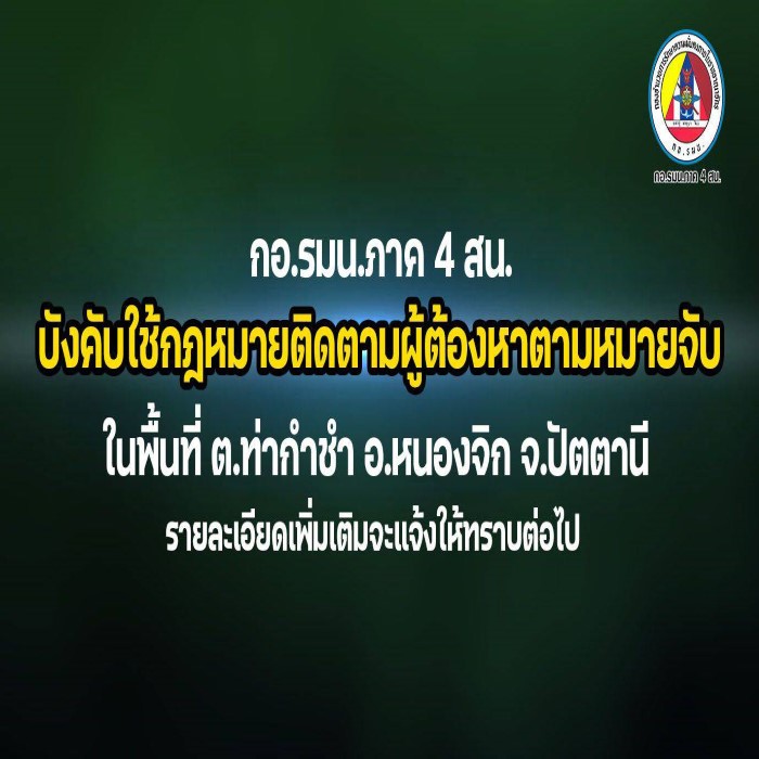 เมื่อวันที่ 11 มีนาคม 2569 เวลา 15.35 น. กองอำนวยการรักษาความมั่นคงภายในภาค 4 ส่วนหน้า ร่วมกับหน่วยงานความมั่นคงในพื้นที่ เข้าดำเนินการบังคับใช้กฎหมายเพื่อติดตามจับกุมบุคคลตามหมายจับ ซึ่งมีการเคลื่อนไหวอยู่ในพื้นที่ ตำบลท่ากำชำ อำเภอหนองจิก จังหวัดปัตตานี