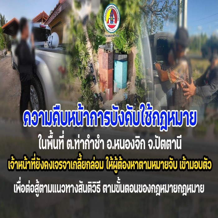 จากกรณีที่กองอำนวยการรักษาความมั่นคงภายในภาค 4 ส่วนหน้า ร่วมกับหน่วยงานความมั่นคงในพื้นที่ เข้าดำเนินการบังคับใช้กฎหมายเพื่อติดตามจับกุมบุคคลตามหมายจับในพื้นที่ ตำบลท่ากำชำ อำเภอหนองจิก จังหวัดปัตตานี นั้น