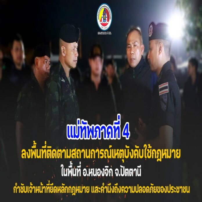 เมื่อวันที่ 11 มีนาคม 2569 เวลา 20.30 น. พลโท นรธิป โพยนอก แม่ทัพภาคที่ 4 ในฐานะผู้อำนวยการรักษาความมั่นคงภายในภาค 4 ได้ลงพื้นที่ ตำบลท่ากำชำ อำเภอหนองจิก จังหวัดปัตตานี เพื่อติดตามสถานการณ์และตรวจสอบการปฏิบัติของเจ้าหน้าที่ ภายหลังการดำเนินการ บังคับใช้กฎหมาย ต่อผู้ต้องหาตามหมายจับ ซึ่งเกิดเหตุใช้อาวุธยิงใส่เจ้าหน้าที่ก่อนหน้านี้