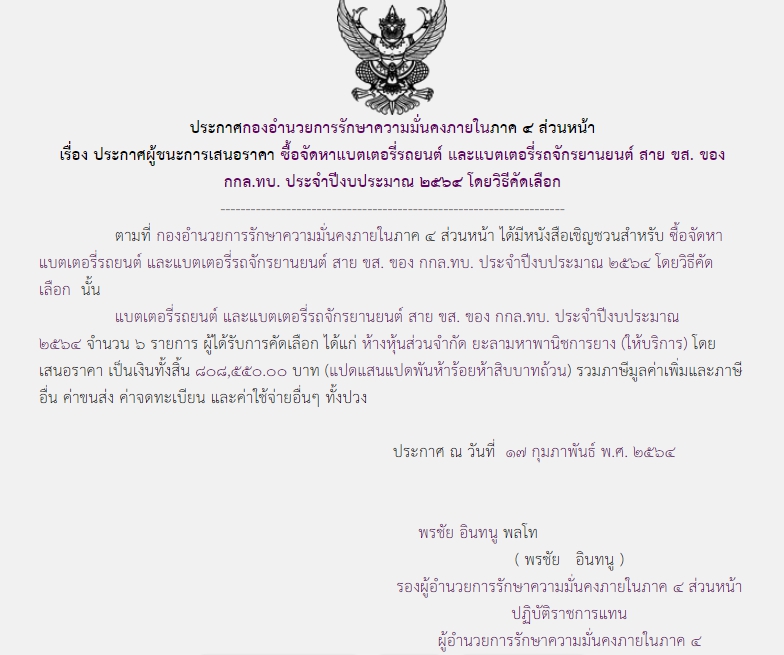 ประกาศผู้ชนะการเสนอราคา ซื้อจัดหาแบตเตอรี่รถยนต์ และแบตเตอรี่รถจักรยานยนต์ สาย ขส. ของ กกล.ทบ. ประจำปีงบประมาณ ๒๕๖๔ โดยวิธีคัดเลือก ( ๘๐๘,๕๕๐.๐๐ บาท )
