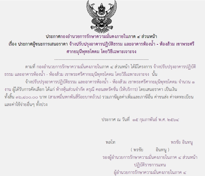 ประกาศผู้ชนะการเสนอราคา จ้างปรับปรุงอาคารปฏิบัติธรรม และอาคารห้องน้ำ – ห้องส้วม เขาพระศรีศากยมุนีพุทธโคดม โดยวิธีเฉพาะเจาะจง ( ๓๖,๔๐๐.๐๐ บาท )