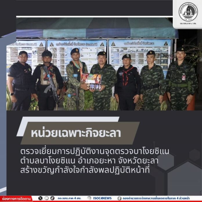 เมื่อวันที่ 12 มีนาคม 2569 เวลา 22.30 น. พ.อ.ภูมิพัฒน์ บุญเรืองขาว รองผู้บังคับหน่วยเฉพาะกิจยะลา (1) เดินทางลงพื้นที่ ตรวจเยี่ยมการปฏิบัติงานของกำลังพลประจำจุดตรวจบาโงยซิแน เพื่อรับทราบสถานการณ์และให้กำลังใจเจ้าหน้าที่ผู้ปฏิบัติงานในพื้นที่