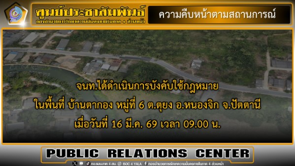 พันเอก ยุทธนาม เพชรม่วง โฆษกกองอำนวยการรักษาความมั่นคงภายในภาค 4 ส่วนหน้า แถลงความคืบหน้าผลการปฏิบัติการบังคับใช้กฎหมายในพื้นที่ บ้านตากอง หมู่ที่ 6 ตำบลตุยง อำเภอหนองจิก จังหวัดปัตตานี ซึ่งเป็นการขยายผลจากการบังคับใช้กฎหมายในพื้นที่ ตำบลท่ากำชำ อำเภอหนองจิก จังหวัดปัตตานี หลังเจ้าหน้าที่ฝ่ายความมั่นคงสืบทราบความเคลื่อนไหวของกลุ่มผู้ก่อเหตุรุนแรงที่เกี่ยวข้องกับเหตุการณ์ความไม่สงบในพื้นที่ และพบว่ามีการเคลื่อนย้ายเข้ามาหลบซ่อนตัวอยู่ในพื้นที่ดังกล่าว เจ้าหน้าที่ฝ่ายความมั่นคงสนธิกำลัง 3 ฝ่าย ประกอบด้วย เจ้าหน้าที่ทหาร ตำรวจ และฝ่ายปกครอง เข้าดำเนินการบังคับใช้กฎหมาย เพื่อเข้าพิสูจน์ทราบ โดยในระหว่างการปฏิบัติ เจ้าหน้าที่ได้ดำเนินการตามขั้นตอนและมาตรการตามลำดับจากเบาไปหาหนัก พร้อมทั้งพยายามใช้การเจรจาเกลี้ยกล่อมให้บุคคลภายในพื้นที่ออกมาแสดงตัวและมอบตัวต่อเจ้าหน้าที่ เพื่อเข้าสู่กระบวนการยุติธรรมและต่อสู้คดีตามกระบวนการทางกฎหมาย ตามแนวทางสันติวิธี