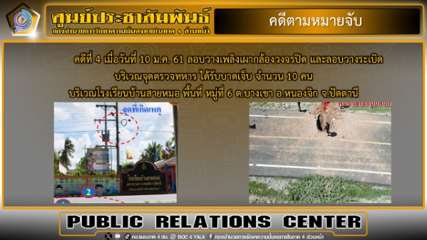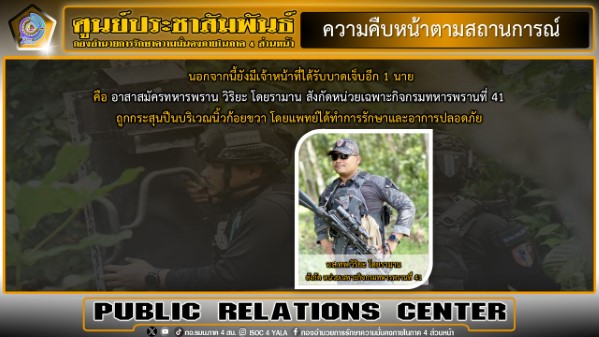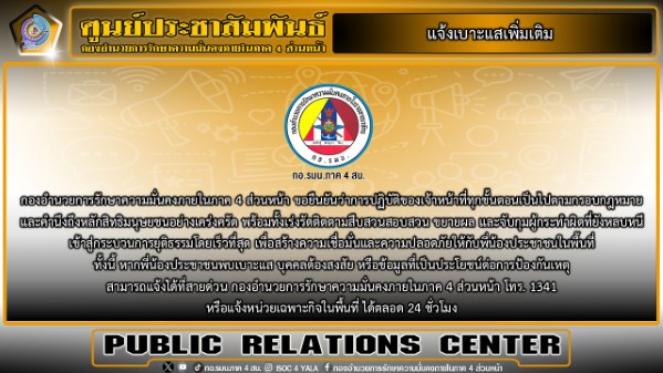 กองอำนวยการรักษาความมั่นคงภายในภาค 4 ส่วนหน้า ขอความร่วมมือพี่น้องประชาชน หากพบเบาะแส รวมถึงบุคคลต้องสงสัยเข้ามาเคลื่อนไหวในพื้นที่ สามารถแจ้งได้ที่หมายเลขโทรศัพท์สายด่วน กอ.รมน.ภาค 4 สน. 1341 และหน่วยเฉพาะกิจในพื้นที่ได้ตลอด 24 ชั่วโมง