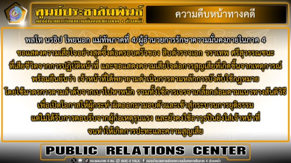 โฆษกกองอำนวยการรักษาความมั่นคงภายในภาค 4 ส่วนหน้า กล่าวเพิ่มเติมอีกว่า พลโท นรธิป โพยนอก แม่ทัพภาคที่ 4 ในฐานะผู้อำนวยการรักษาความมั่นคงภายในภาค 4 ได้แสดงความเสียใจอย่างสุดซึ้งต่อครอบครัวของ สิบตำรวจเอก วราเทพ ศรีสุวรรณชนะ ที่เสียชีวิตจากการปฏิบัติหน้าที่ และขอแสดงความเสียใจต่อการสูญเสียที่เกิดขึ้นจากเหตุการณ์ดังกล่าว พร้อมยืนยันว่า เจ้าหน้าที่ได้พยายามดำเนินการตามหลักการบังคับใช้กฎหมาย โดยใช้มาตรการตามลำดับจากเบาไปหาหนัก รวมทั้งใช้การเจรจาเกลี้ยกล่อมตามแนวทางสันติวิธี เพื่อเปิดโอกาสให้ผู้กระทำผิดออกมามอบตัวและเข้าสู่กระบวนการยุติธรรม แต่ไม่ได้รับการตอบรับจากกลุ่มผู้ก่อเหตุรุนแรง และยังคงใช้อาวุธปืนยิงใส่เจ้าหน้าที่ จนทำให้เกิดการปะทะและความสูญเสียดังกล่าว