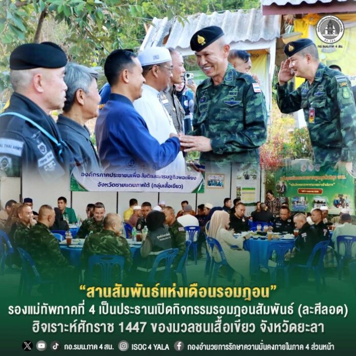 วันที่ 16 มีนาคม 2569 เวลา 17.30 น. ณ ศูนย์การเรียนรู้เศรษฐกิจพอเพียง จังหวัดยะลา บ้านปากาซาแม ตำบลวังพญา อำเภอรามัน จังหวัดยะลา พลตรี กรกฎ ภู่โชติ รองแม่ทัพภาคที่ 4 / รองผู้อำนวยการรักษาความมั่นคงภายในภาค 4 ส่วนหน้า ให้เกียรติเป็นประธานในกิจกรรมรอมฎอนสัมพันธ์ (ละศีลอด) ฮิจเราะห์ศักราช 1447 ขององค์กรภาคประชาชนเพื่อสันติและเศรษฐกิจพอเพียง จังหวัดยะลา (มวลชนเสื้อเขียว) ซึ่งจัดขึ้นในห้วงเดือนอันประเสริฐแห่งการถือศีลอด เดือนรอมฎอน โดยมี นายชานนท์ เจะหะมะ ประธานมวลชนเสื้อเขียว พร้อมด้วยผู้แทนหน่วยงานในพื้นที่ อาทิ หน่วยเฉพาะกิจยะลา ผู้แทนนายอำเภอรามัน ผู้บังคับการกรมทหารพรานที่ 41 กองพันทหารราบที่ 2 กรมทหารราบที่ 152 ผู้บังคับชุดควบคุมที่ 953 ผู้กำกับการสถานีตำรวจภูธรโกตาบารู สารวัตรใหญ่สถานีตำรวจภูธรท่าธง นายกองค์การบริหารส่วนตำบลวังพญา กำนัน ผู้ใหญ่บ้าน ผู้นำศาสนา และพี่น้องประชาชนในพื้นที่จังหวัดยะลา เข้าร่วมให้การต้อนรับและร่วมละศีลอดอย่างพร้อมเพรียง