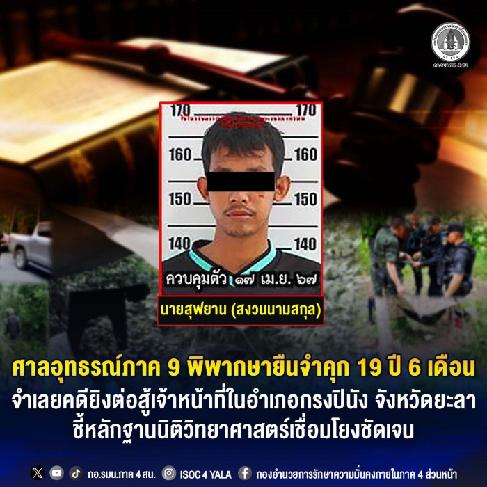 ศาลอุทธรณ์ภาค 9 อ่านคำพิพากษา ในคดีหมายเลขดำที่ อ.773/67 ซึ่งมี นายสุฟยาน (ขอสงวนนามสกุล ) เป็นจำเลย ในความผิดเกี่ยวกับการก่อการร้ายและอาวุธปืน คดีดังกล่าวสืบเนื่องจากเหตุการณ์เมื่อวันที่ 4 ธันวาคม 2562 เจ้าหน้าที่ได้สนธิกำลังเข้าบังคับใช้กฎหมายและเกิดการปะทะกับกลุ่มคนร้ายในพื้นที่ บ้านตะโล๊ะสะโต หมู่ที่ 6 ตำบลสะเอะ อำเภอกรงปินัง จังหวัดยะลา ซึ่งจากการตรวจสอบที่เกิดเหตุในขณะนั้น เจ้าหน้าที่สามารถตรวจยึดของใช้ส่วนตัวและอุปกรณ์หลายรายการที่กลุ่มผู้ก่อเหตุทิ้งไว้