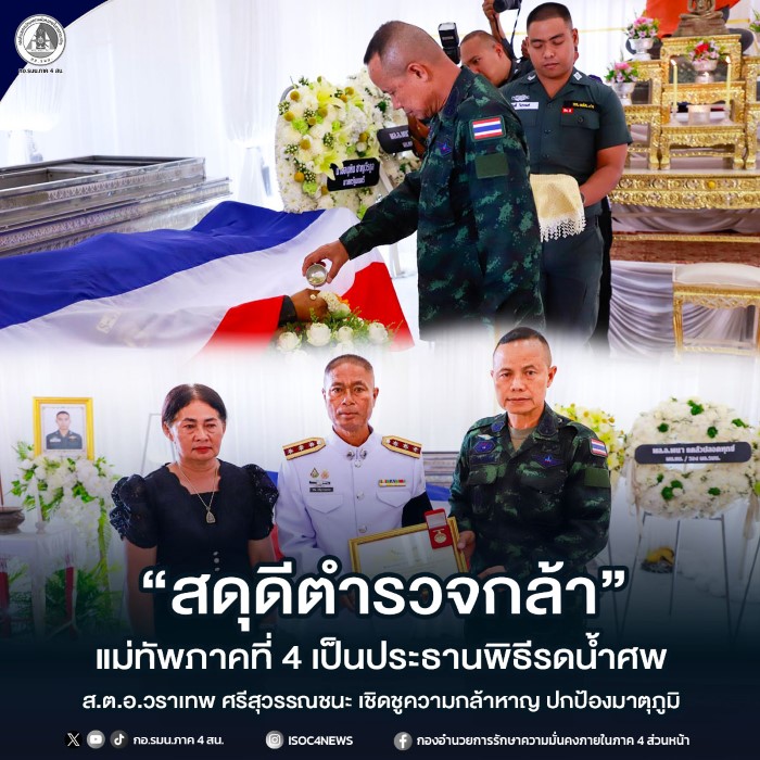 วันนี้ (17 มีนาคม 2569) เวลา 15.00 น. ที่ศาลาบำเพ็ญกุศล วัดแหลมวัง ตำบลคูขุด อำเภอสทิงพระ จังหวัดสงขลา พลโท นรธิป โพยนอก แม่ทัพภาคที่ 4 / ผู้อำนวยการรักษาความมั่นคงภายในภาค 4 เป็นประธานในพิธีรดน้ำศพ สิบตำรวจเอก วราเทพ ศรีสุวรรณชนะ ผู้บังคับหมู่ กองกำกับการตำรวจตระเวนชายแดนที่ 43 ซึ่งถูกยิงได้รับบาดเจ็บสาหัสและเสียชีวิตในเวลาต่อมา ขณะปฏิบัติหน้าที่เข้าบังคับใช้กฎหมายในพื้นที่ตำบลตุยง อำเภอหนองจิก จังหวัดปัตตานี เมื่อเช้าวันที่ 16 มีนาคมที่ผ่านมา โดยมี พลตำรวจโท รุ่งโรจน์ ฐากูรปุณญศิริ ผู้บัญชาการตำรวจตระเวนชายแดน, พลตำรวจโท ปิยะวัฒน์ เฉลิมศรี ผู้บัญชาการตำรวจภูธรภาค 9, นายรัฐศาสตร์ ชิดชู ผู้ว่าราชการจังหวัดสงขลา, พลตำรวจตรี พหล เกตุแก้ว ผู้บังคับการตำรวจตระเวนชายแดนภาค 4 พร้อมด้วยหัวหน้าส่วนราชการ เพื่อนข้าราชการตำรวจ ทหาร ตลอดจนพี่น้องประชาชนในพื้นที่เข้าร่วมพิธีด้วยความอาลัย