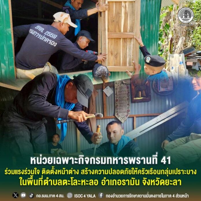 เมื่อวันที่ 17 มีนาคม 2569 เวลา 09.00 น. หน่วยเฉพาะกิจกรมทหารพรานที่ 41 จัดกำลังพลจากชุดปฏิบัติการกิจการพลเรือน กองร้อยทหารพรานที่ 4102 ลงพื้นที่ตำบลตะโละหะลอ อำเภอรามัน จังหวัดยะลา เพื่อดำเนินการช่วยเหลือประชาชนในพื้นที่ โดยได้บูรณาการความร่วมมือกับสารวัตรกำนัน ชุดคุ้มครองตำบลตะโละหะลอ รวมถึงผู้นำท้องที่และผู้นำท้องถิ่น ร่วมกันเข้าช่วยเหลือติดตั้งหน้าต่างบ้านให้กับ นายมุสลิม หะยีมูน๊ะ และครอบครัว ซึ่งเป็นครัวเรือนกลุ่มเปราะบาง เพื่อเสริมสร้างความมั่นคงปลอดภัยในที่อยู่อาศัย และบรรเทาความเดือดร้อนในชีวิตประจำวัน
