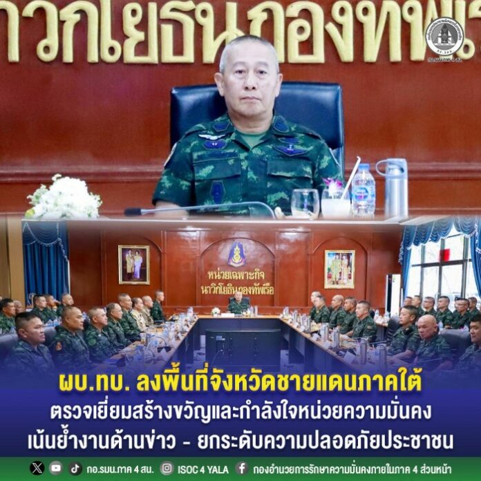 วันนี้ (18 มีนาคม 2569) พลเอก พนา แคล้วปลอดทุกข์ ผู้บัญชาการทหารบก / รองผู้อำนวยการรักษาความมั่นคงภายในราชอาณาจักร พร้อมคณะผู้บังคับบัญชากองทัพบก เดินทางลงพื้นที่จังหวัดนราธิวาส เพื่อตรวจเยี่ยมและสร้างขวัญกำลังใจแก่กำลังพลที่ปฏิบัติหน้าที่ในจังหวัดชายแดนภาคใต้ พร้อมรับฟังการบรรยายสรุปผลการปฏิบัติงาน และมอบนโยบายการพัฒนาการแก้ไขปัญหาร่วมกับหน่วยงานด้านความมั่นคง เจ้าหน้าที่ทหาร ตำรวจ และฝ่ายปกครองในพื้นที่ โดยมี พลโท นรธิป โพยนอก แม่ทัพภาคที่ 4 / ผู้อำนวยการรักษาความมั่นคงภายในภาค 4, ผู้บังคับบัญชากองกำลังตำรวจจังหวัดชายแดนภาคใต้, ผู้แทนศูนย์อำนวยการบริหารจังหวัดชายแดนภาคใต้, ผู้บังคับหน่วยเฉพาะกิจนาวิกโยธิน กองทัพเรือ, ผู้บังคับหน่วยเฉพาะกิจนราธิวาส, ผู้บังคับหน่วยเฉพาะกิจในพื้นที่ หัวหน้าส่วนราชการ และเจ้าหน้าที่ที่เกี่ยวข้องเข้าร่วมประชุม ณ ห้องประชุมหน่วยเฉพาะกิจนาวิกโยธิน กองทัพเรือ ค่ายจุฬาภรณ์ อำเภอเมือง จังหวัดนราธิวาส