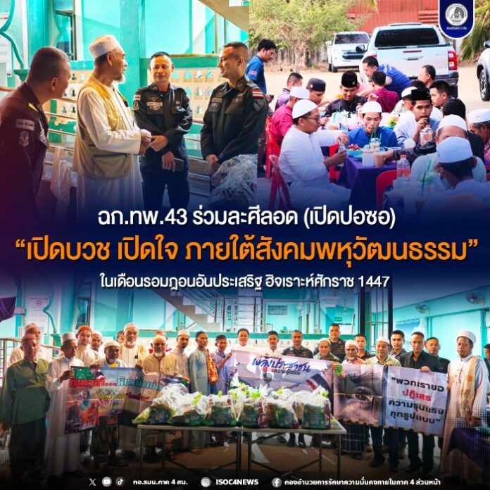 เมื่อวันที่ 18 มีนาคม 2569 เวลา 18.30 น. พันเอก ชาญฤทธิ์ ฮันสราช ผู้บังคับหน่วยเฉพาะกิจกรมทหารพรานที่ 43 พร้อมกำลังพล ร่วมกับเจ้าหน้าที่ 3 ฝ่าย และผู้นำชุมชน/ผู้นำท้องถิ่น เข้าร่วมกิจกรรมการละศีลอด (เปิดปอซอ) “เปิดบวช เปิดใจ ครองใจชาวคลองช้าง“ ณ มัสยิดดารุลอาบีดีน หมู่ที่ 4 บ้านคลองช้าง ตำบลนาเกตุ อำเภอโคกโพธิ์ จังหวัดปัตตานี โดยมี พันเอก สฐิรพงษ์ อาจหาญ รองผู้บังคับหน่วยเฉพาะปัตตานี , นายเชาวลิต สิทธิฤทธิ์ นายอำเภอโคกโพธิ์ และพันตำรวจโท นครชัย บุญจบ รอง ผกก.สส.สภ.โคกโพธิ์ เป็นประธานร่วมฯ กิจกรรมในครั้งนี้จัดขึ้นเพื่อส่งเสริมความเข้าใจ ร่วมแสดงความยินดีและสนับสนุนการปฏิบัติศาสนกิจของพี่น้องชาวไทยมุสลิม เสริมสร้างความมั่นคงและภาพลักษณ์สังคมพหุวัฒนธรรมที่สวยงาม และปฏิเสธความรุนแรงทุกรูปแบบ รวมถึงการปฏิบัติตามหลักศาสนาที่ถูกต้อง เช่น การซะอีดที่แท้จริง โดยร่วมมือกันสร้างพื้นที่สันติสุขในชุมชนอย่างยั่งยืน