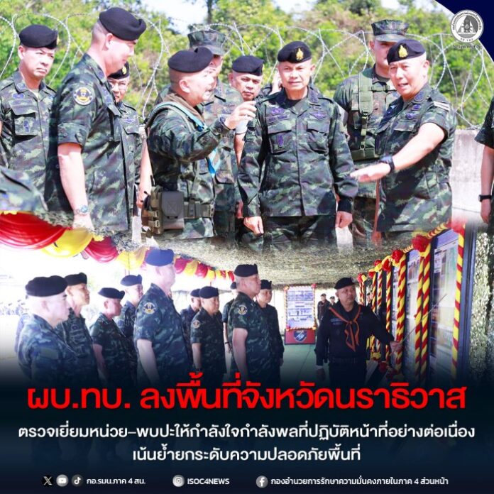 วันที่ 18 มีนาคม 2569 พลเอก พนา แคล้วปลอดทุกข์ ผู้บัญชาการทหารบก / รองผู้อำนวยการรักษาความมั่นคงภายในราชอาณาจักร พร้อมคณะผู้บังคับบัญชาระดับสูงของกองทัพบก เดินทางลงพื้นที่จังหวัดนราธิวาส เพื่อตรวจเยี่ยมและติดตามสถานการณ์ด้านความมั่นคงในพื้นที่จังหวัดชายแดนภาคใต้ ณ กองร้อยป้องกันชายแดนที่ 5 ตำบลปาเสมัส อำเภอสุไหงโก-ลก จังหวัดนราธิวาส ในโอกาสนี้ ผู้บัญชาการทหารบกได้รับฟังการบรรยายสรุปผลการปฏิบัติงาน สถานการณ์ด้านความมั่นคงในพื้นที่ ปัญหาอุปสรรค รวมถึงแนวทางการขับเคลื่อนภารกิจของกองบังคับการกองร้อยป้องกันชายแดนที่ 5 และหน่วยเฉพาะกิจนาวิกโยธินกองทัพเรือที่ 33 ซึ่งรับผิดชอบพื้นที่ชายแดนที่มีความสำคัญเชิงยุทธศาสตร์ พร้อมทั้งได้พบปะพูดคุยกับกำลังพล เพื่อสร้างขวัญและกำลังใจในการปฏิบัติหน้าที่ ท่ามกลางสถานการณ์ที่ยังคงต้องเฝ้าระวังอย่างใกล้ชิด โดยมี พันเอกยุทธนา สายประเสริฐ ผู้บังคับการกองบังคับการควบคุมสุริโยทัย, นาวาโท พีรพงษ์ วงษ์จินเจริญกุล ผู้บังคับหน่วยเฉพาะกิจนาวิกโยธินกองทัพเรือที่ 33, ร้อยเอก ธนพนธ์ พันธ์โภชน์ ผู้บังคับกองร้อยป้องกันชายแดนที่ 5 ผู้บังคับหน่วยในพื้นที่ หัวหน้าส่วนราชการ และกำลังพลร่วมให้การต้อนรับ