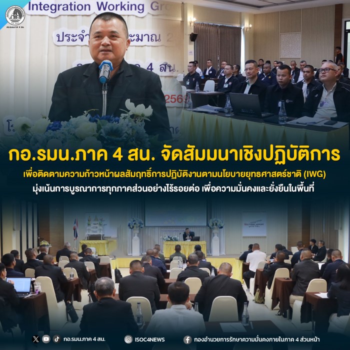 วันที่ 19 มีนาคม 2569 เวลา 09.30 น. ณ โรงแรมเซาท์เทอร์นแอร์พอร์ต อำเภอหาดใหญ่ จังหวัดสงขลา พลตรี อนุชา โนนคู่เขตโขง ผู้อำนวยการส่วนพัฒนายุทธศาสตร์ กองอำนวยการรักษาความมั่นคงภายในภาค 4 ส่วนหน้า เป็นประธานในพิธีเปิดการประชุมสัมมนาเชิงปฏิบัติการเพื่อติดตามความก้าวหน้าผลสัมฤทธิ์การปฏิบัติงานตามนโยบายยุทธศาสตร์ชาติ ประจำปีงบประมาณ 2569 ภายใต้กลไกการขับเคลื่อนการแก้ไขปัญหาจังหวัดชายแดนภาคใต้ (Integrated Working Groups : IWG) ซึ่งจัดขึ้นระหว่างวันที่ 18–20 มีนาคม 2569 โดยมีผู้แทนจากส่วนราชการ มหาวิทยาลัยนราธิวาสราชนครินทร์ และหน่วยงานที่เกี่ยวข้องทั้งภายในและภายนอกโครงสร้าง กอ.รมน.ภาค 4 สน. เข้าร่วมประชุมรวม 96 คน