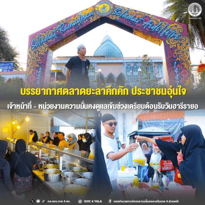 ขณะเดียวกัน เจ้าหน้าที่สถานีตำรวจภูธรเมืองยะลา ร่วมกับหน่วยงานความมั่นคงในพื้นที่ ทั้งฝ่ายทหาร ฝ่ายปกครอง และภาคส่วนที่เกี่ยวข้อง ได้บูรณาการกำลังลงพื้นที่อย่างต่อเนื่อง ทั้งการอำนวยความสะดวกด้านการจราจร การจัดระเบียบพื้นที่การค้า และการดูแลความปลอดภัยในจุดสำคัญโดยรอบตลาด เพื่อให้ประชาชนสามารถจับจ่ายใช้สอยได้อย่างสะดวกและมั่นใจ การปฏิบัติหน้าที่ของเจ้าหน้าที่เป็นไปด้วยความเรียบร้อย สุภาพ และใกล้ชิดกับประชาชน สร้างบรรยากาศแห่งความอุ่นใจ และสะท้อนถึงความร่วมมือระหว่างเจ้าหน้าที่กับชุมชนในการดูแลพื้นที่ให้มีความปลอดภัยอย่างเข้มแข็งในช่วงเทศกาลสำคัญ