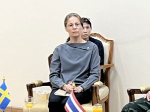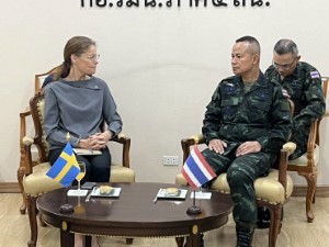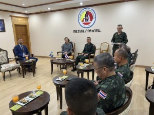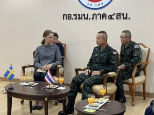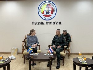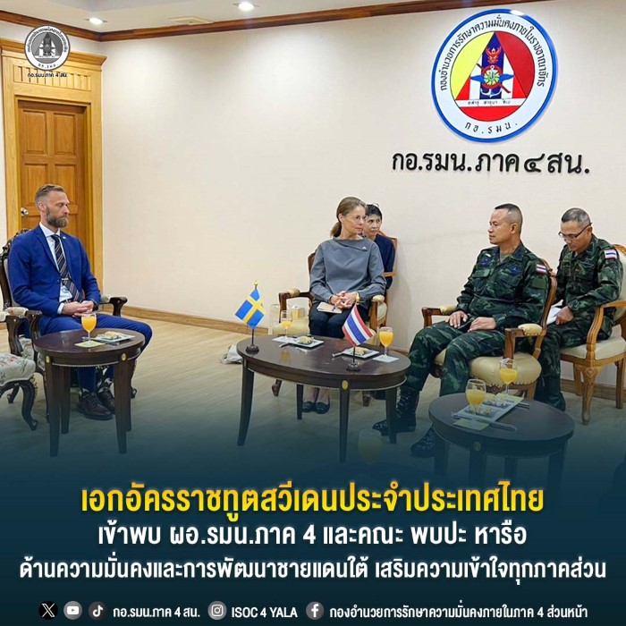 วันที่ 17 มีนาคม 2569 เวลา 09.40 น. ณ ห้องรับรอง กองอำนวยการรักษาความมั่นคงภายในภาค 4 ส่วนหน้า ค่ายสิรินธร อำเภอยะรัง จังหวัดปัตตานี พลโท นรธิป โพยนอก แม่ทัพภาคที่ 4 ในฐานะผู้อำนวยการรักษาความมั่นคงภายในภาค 4 พร้อมคณะ ร่วมให้การต้อนรับ นางอันนา ฮัมมาร์เกรน (H.E. Mrs. Anna Hammargren) เอกอัครราชทูตสวีเดนประจำประเทศไทย และคณะ จำนวน 3 ท่าน การเดินทางครั้งนี้เป็นส่วนหนึ่งของการลงพื้นที่จังหวัดชายแดนภาคใต้ ระหว่างวันที่ 16–18 มีนาคม 2569 เพื่อหารือ แลกเปลี่ยนความคิดเห็นกับหน่วยงานภาครัฐ ภาควิชาการ ภาคประชาสังคม และผู้นำศาสนา ตลอดจนเสริมสร้างความเข้าใจเกี่ยวกับสถานการณ์ด้านความมั่นคง เศรษฐกิจ และสังคมในพื้นที่ รวมถึงติดตามแนวทางการส่งเสริมการพัฒนาเศรษฐกิจและสังคมของชุมชน เพื่อสร้างความร่วมมือระหว่างประเทศสวีเดนกับหน่วยงานในระดับพื้นที่