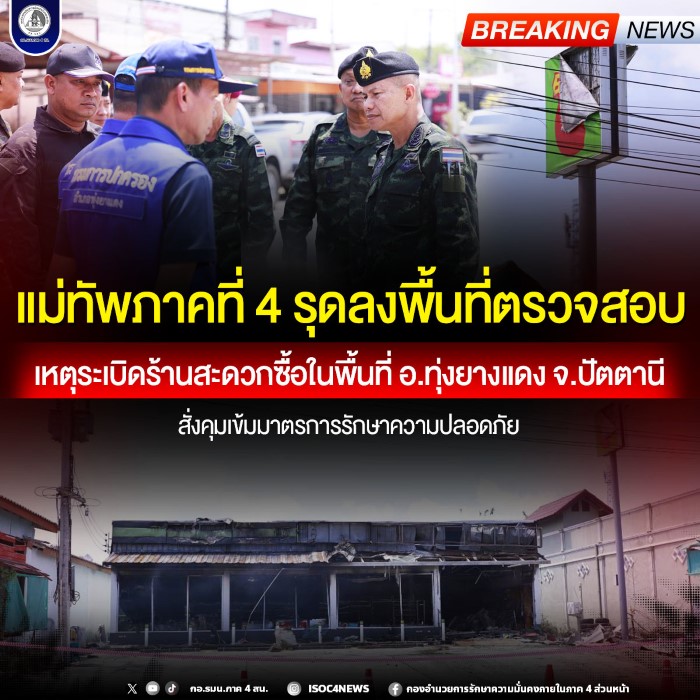 จากเหตุการณ์เมื่อเวลา 03.10 น. ของวันที่ 20 มีนาคม 2569 เกิดเหตุคนร้ายลอบวางระเบิดบริเวณร้านสะดวกซื้อบิ๊กซี ในพื้นที่อำเภอทุ่งยางแดง จังหวัดปัตตานี ส่งผลให้เกิดเพลิงไหม้และทรัพย์สินได้รับความเสียหาย