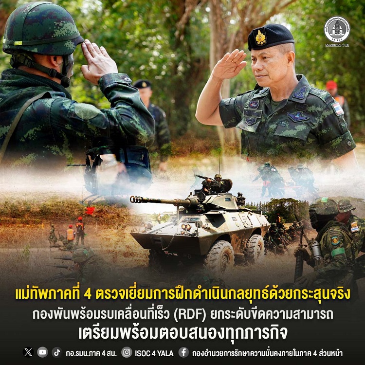 เมื่อวันที่ 24 มีนาคม 2569 ณ พื้นที่การฝึกค่ายธนะรัชต์ อำเภอปราณบุรี จังหวัดประจวบคีรีขันธ์ พลโท นรธิป โพยนอก แม่ทัพภาคที่ 4 / ผู้อำนวยการรักษาความมั่นคงภายในภาค 4 เป็นประธานในการตรวจเยี่ยมการฝึกกองพันพร้อมรบเคลื่อนที่เร็ว (Rapid Deployment Force : RDF) ของกองทัพภาคที่ 4 ประจำปี 2569 ซึ่งจัดกำลังหลักจาก กองพันทหารราบที่ 1 กรมทหารราบที่ 25 (ร.25 พัน.1)