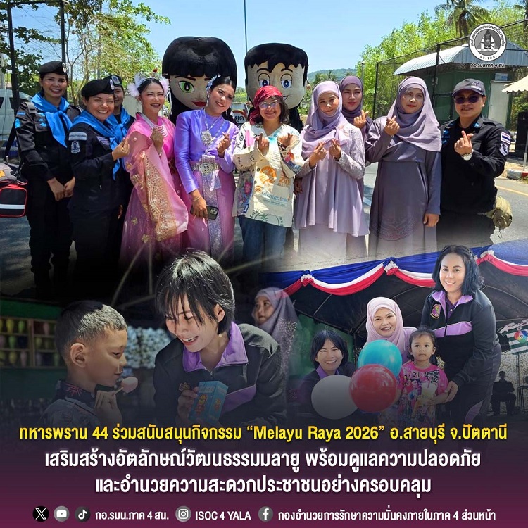 วันที่ 24 มีนาคม 2569 เวลา 11.00 น. ณ บริเวณชายหาดวาสุกรี ตำบลตะลุบัน อำเภอสายบุรี จังหวัดปัตตานี หน่วยเฉพาะกิจกรมทหารพรานที่ 44 ร่วมส่งเสริมและสนับสนุนการจัดกิจกรรม “Melayu Raya 2026” ซึ่งจัดขึ้นระหว่างวันที่ 23–24 มีนาคม 2569 โดยได้จัดกำลังพลอำนวยความสะดวกและดูแลความปลอดภัยให้กับพี่น้องประชาชนตามเส้นทางสัญจรในพื้นที่รับผิดชอบ อำเภอสายบุรี ประจำจุดตรวจสำคัญ อาทิ บริเวณหน้าหน่วยเฉพาะกิจกรมทหารพรานที่ 44, ด่านตรวจเตราะปลิง และด่านตรวจกอตอ เพื่อให้ประชาชนสามารถเดินทางเข้าร่วมกิจกรรมได้อย่างสะดวก ปลอดภัย และอุ่นใจ