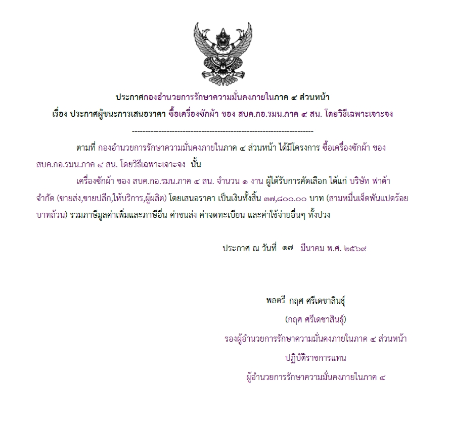 จัดซื้อ จัดจ้างประกาศผู้ชนะการเสนอราคา ประกาศ กองอํานวยการรักษาความมั่นคงภายในภาค ๔ ส่วนหน้า เรื่อง ประกาศผู้ชนะการเสนอราคา ซื้อเครื่องซักผ้า ของ สบค.กอ.รมน.ภาค ๔ สน. โดยวิธีเฉพาะเจาะจง March 21, 2026 9 Share Facebook Twitter Google+ Telegram LINE
