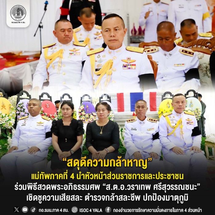 วันนี้ (20 มีนาคม 2569) เวลา 19.00 น. พลโท นรธิป โพยนอก แม่ทัพภาคที่ 4 / ผู้อำนวยการรักษาความมั่นคงภายในภาค 4 เป็นประธานในพิธีสวดพระอภิธรรมศพ สิบตำรวจเอก วราเทพ ศรีสุวรรณชนะ ผู้บังคับหมู่ กองกำกับการตำรวจตระเวนชายแดนที่ 43 ซึ่งถูกยิงได้รับบาดเจ็บสาหัสและเสียชีวิตในเวลาต่อมา ขณะปฏิบัติหน้าที่เข้าบังคับใช้กฎหมายในพื้นที่ตำบลตุยง อำเภอหนองจิก จังหวัดปัตตานี เมื่อเช้าวันที่ 16 มีนาคมที่ผ่านมา ณ ศาลาบำเพ็ญกุศล วัดแหลมวัง อำเภอสทิงพระ จังหวัดสงขลา เพื่อแสดงความอาลัยและสดุดีในความกล้าหาญ พร้อมเชิดชูความเสียสละของผู้วายชนม์ ที่สละชีพเพื่อรักษาไว้ซึ่งมาตุภูมิ