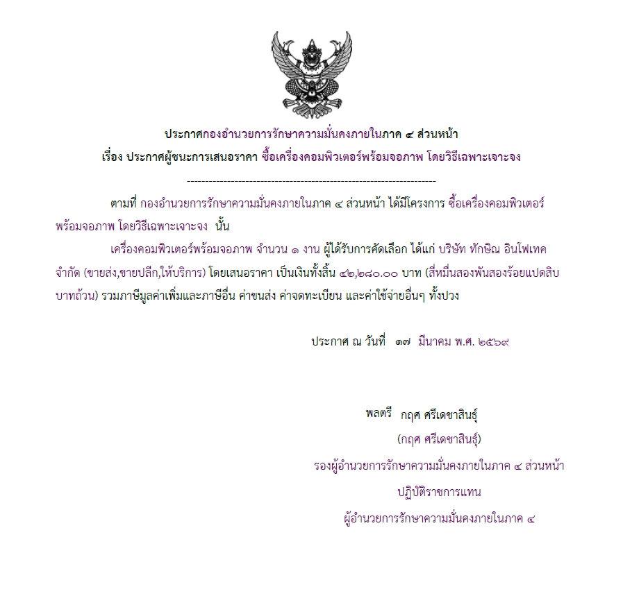 จัดซื้อ จัดจ้างประกาศผู้ชนะการเสนอราคา ประกาศ กองอํานวยการรักษาความมั่นคงภายในภาค ๔ ส่วนหน้า เรื่อง ประกาศผู้ชนะการเสนอราคา ซื้อเครื่องคอมพิวเตอร์พร้อมจอภาพ โดยวิธีเฉพาะเจาะจง March 21, 2026 13 Share Facebook Twitter Google+ Telegram LINE