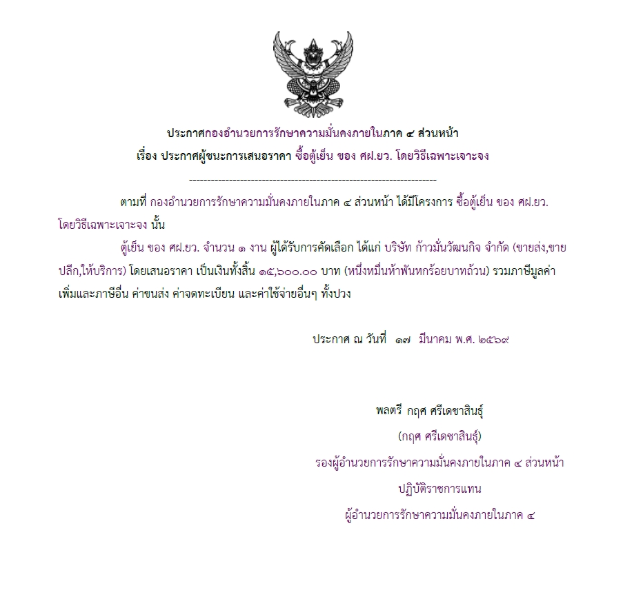 จัดซื้อ จัดจ้างประกาศผู้ชนะการเสนอราคา ประกาศ กองอํานวยการรักษาความมั่นคงภายในภาค ๔ ส่วนหน้า เรื่อง ประกาศผู้ชนะการเสนอราคา ซื้อตู้เย้น ของ ศฝ.ยว. โดยวิธีเฉพาะเจาะจง March 21, 2026 8 Share Facebook Twitter Google+ Telegram LINE