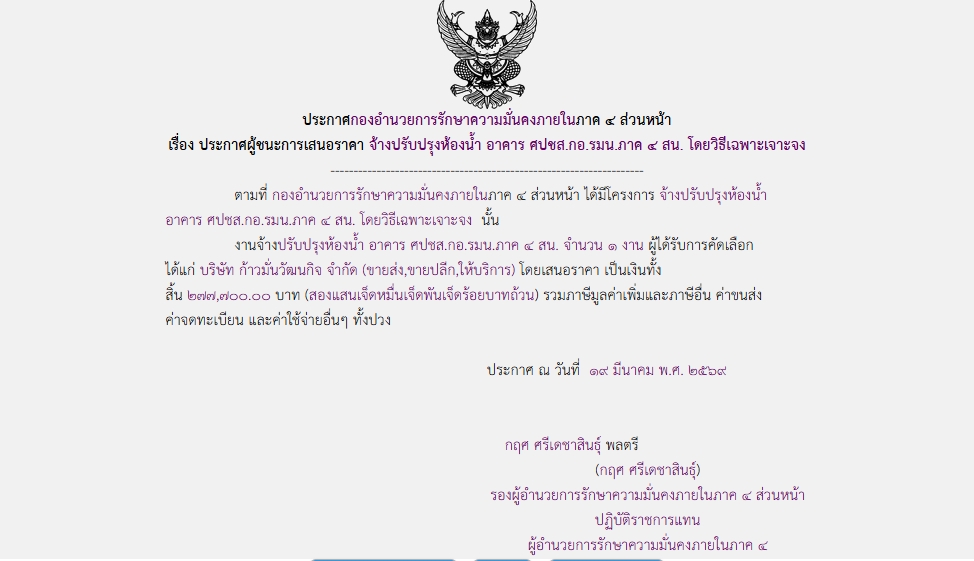 จัดซื้อ จัดจ้างประกาศผู้ชนะการเสนอราคา ประกาศผู้ชนะการเสนอราคา จ้างปรับปรุงห้องน้ำ อาคาร ศปชส.กอ.รมน.ภาค ๔ สน. โดยวิธีเฉพาะเจาะจง March 26, 2026 6 Share Facebook Twitter Google+ Telegram LINE