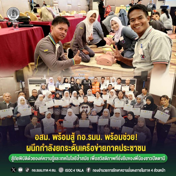 เมื่อวันที่ 25 มีนาคม 2569 ที่ผ่านมา กองอำนวยการรักษาความมั่นคงภายในจังหวัดปัตตานี ได้บูรณาการความร่วมมือกับ หน่วยเฉพาะกิจปัตตานี (ชุดเสริมสร้างความเข้าใจ ฝ่ายพลเรือน), สำนักงานป้องกันและบรรเทาสาธารณภัยจังหวัดปัตตานี, สำนักงานสาธารณสุขจังหวัดปัตตานี และโรงพยาบาลค่ายอิงคยุทธบริหาร ร่วมกันจัดกิจกรรมเสริมสร้างเครือข่ายความมั่นคงด้านการป้องกันและบรรเทาสาธารณภัย ภายใต้แคมเปญ “อสม.พร้อมสู้ กอ.รมน.พร้อมช่วย พ้นภัยพิบัติปัตตานี” ณ โรงแรมปาร์คอินทาวน์ ตำบลสะบารัง อำเภอเมือง จังหวัดปัตตานี