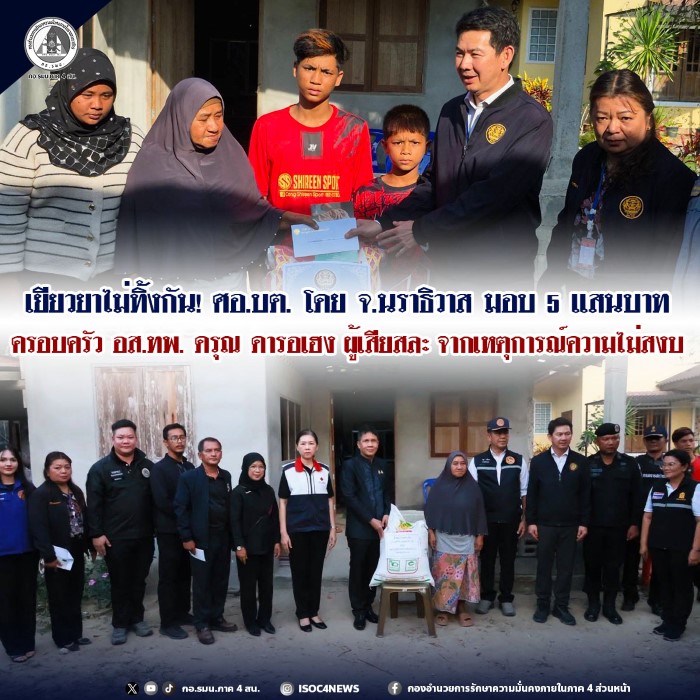 เมื่อวันที่ 26 มีนาคม 2569 ที่บ้านเลขที่ 109/10 หมู่ที่ 5 ตำบลโต๊ะเด็ง อำเภอสุไหงปาดี จังหวัดนราธิวาส ผู้แทนจากศูนย์อำนวยการบริหารจังหวัดชายแดนภาคใต้ (ศอ.บต.) พร้อมด้วยเจ้าหน้าที่กลุ่มงานเยียวยา และศูนย์ปฏิบัติการช่วยเหลือเยียวยาจังหวัดนราธิวาส ลงพื้นที่มอบเงินช่วยเหลือเยียวยาแก่ทายาทของ อส.ทพ.ดรุณ ดารอเฮง อายุ 40 ปี สังกัดหน่วยเฉพาะกิจกองร้อยทหารพรานที่ 4813 ซึ่งเสียชีวิตจากเหตุคนร้ายใช้อาวุธปืนลอบยิง เมื่อวันที่ 24 มีนาคม 2569 ในพื้นที่บ้านโผลง หมู่ที่ 5 ตำบลโต๊ะเด็ง อำเภอสุไหงปาดี จังหวัดนราธิวาส